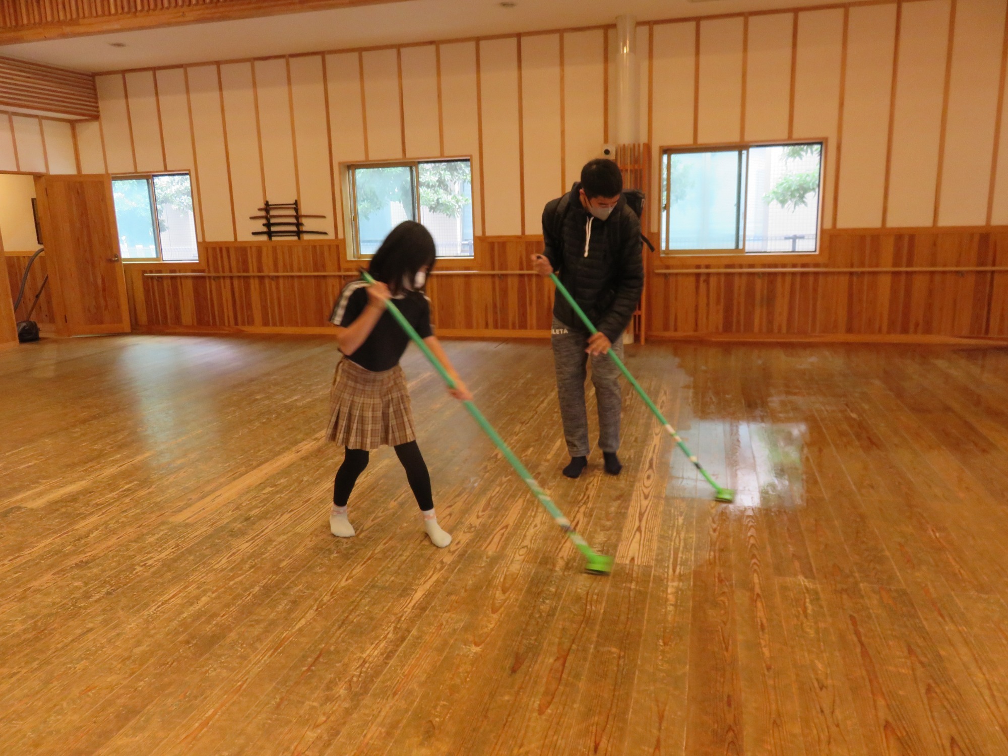 開設から4年が経ち、新築時には館内が真新しい木の香りで包まれていましたが、床に黒光りが現れ、だいぶ貫禄が出てきました。大事なのは館のメンテナンスです。年に一度、11月の終わりには床に武道場向きに作られた油を塗ります。今年の作業は、館長代理の高橋さんのご家族が手伝ってくれました(写真)。床の弾力性を保つとともに、腐食を防いでくれます。また、古武道の「直心影流一劔会」の皆さんが12月の稽古納めの日に大掃除をしてくれました。毎日の利用後の皆さんの清掃とともに、館のメンテナンスに役立っています。